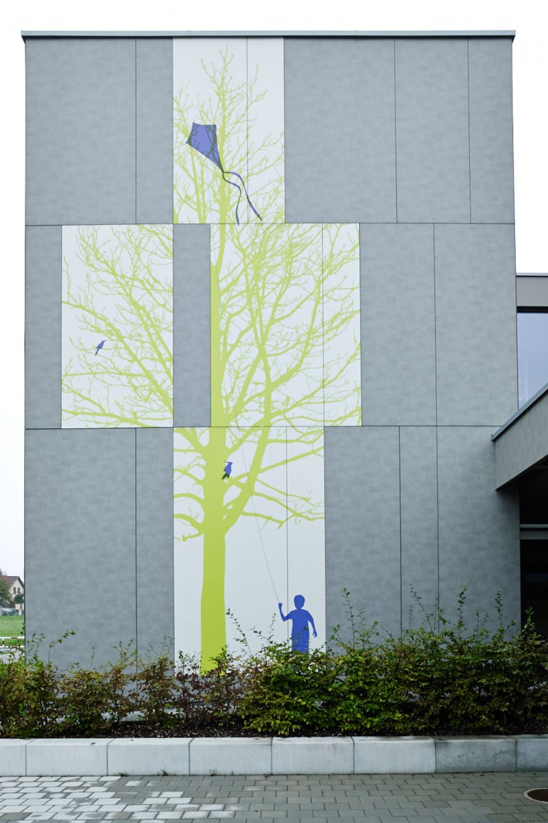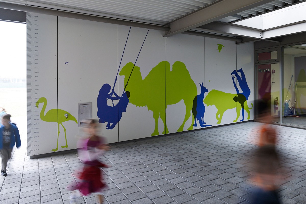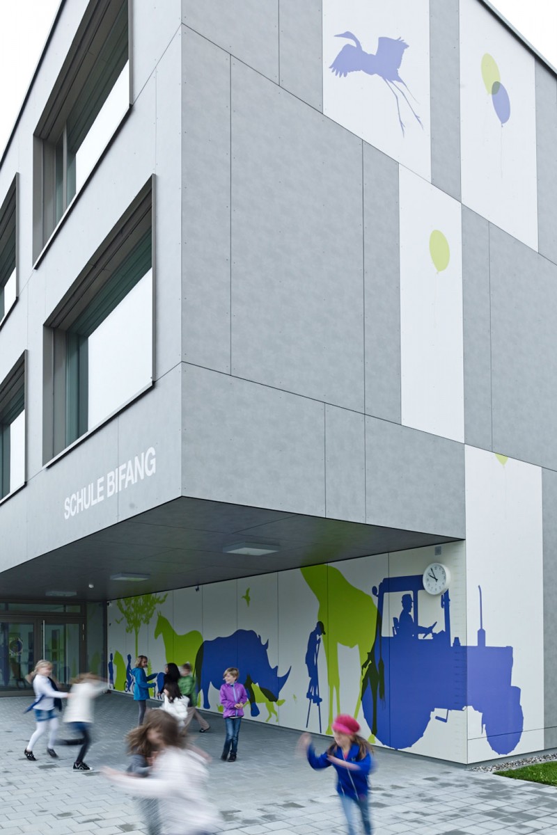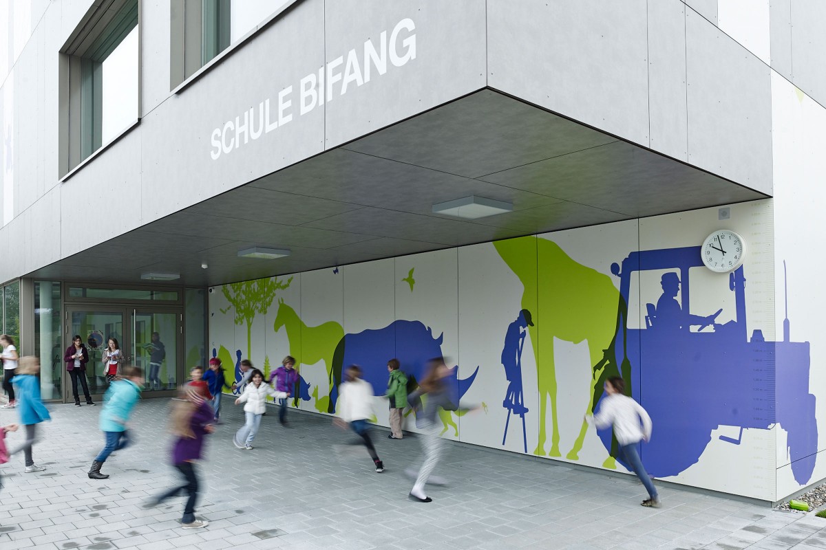 Unterschiedlichste visuelle Interventionen zum Thema «Masstab und Grössenverhältnisse» bereichern die stringente Architektur des Schulhaus Bifang auf sympathische Art und Weise und stellen Inhalt und Form in einen Kontext. Heimische und exotische Tiersilhouetten interagieren unter anderem mit Schülern, Lehrern und Besuchern des Schulhauses und sorgen für ein lebendiges und abwechslungsreiches Umfeld.