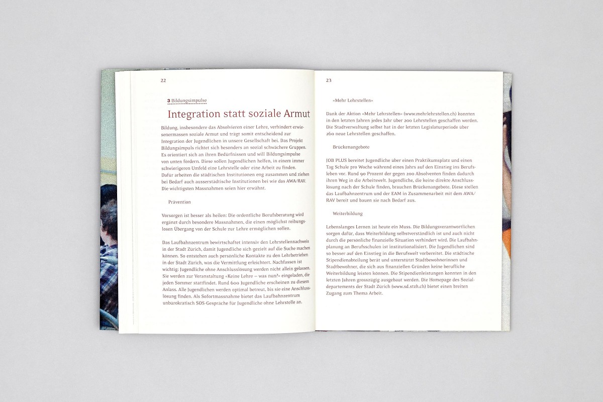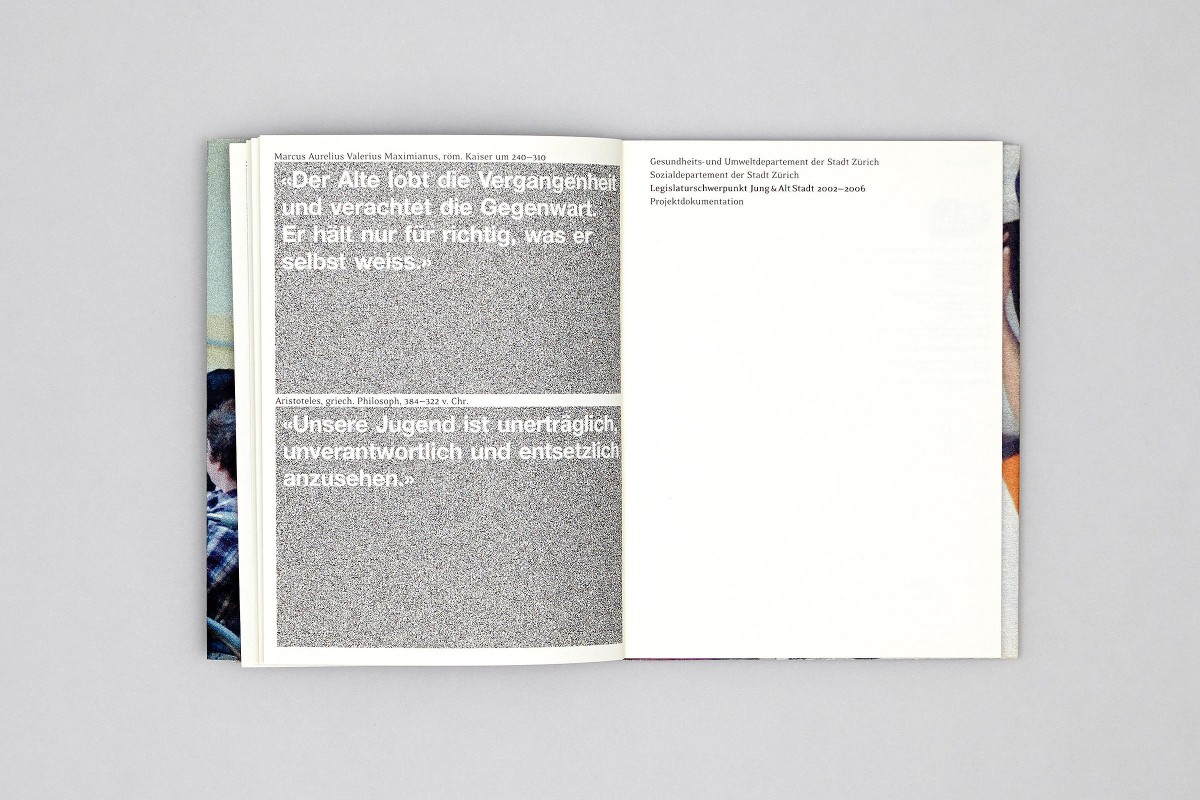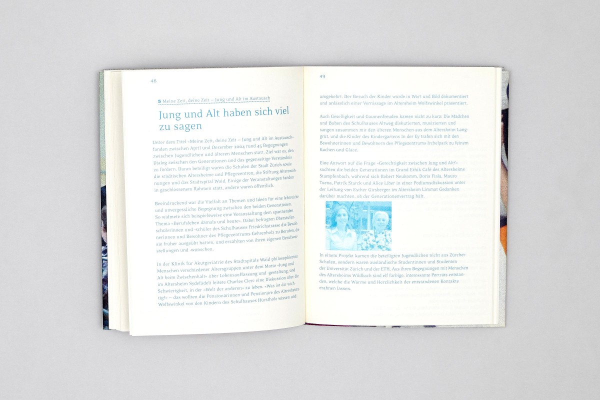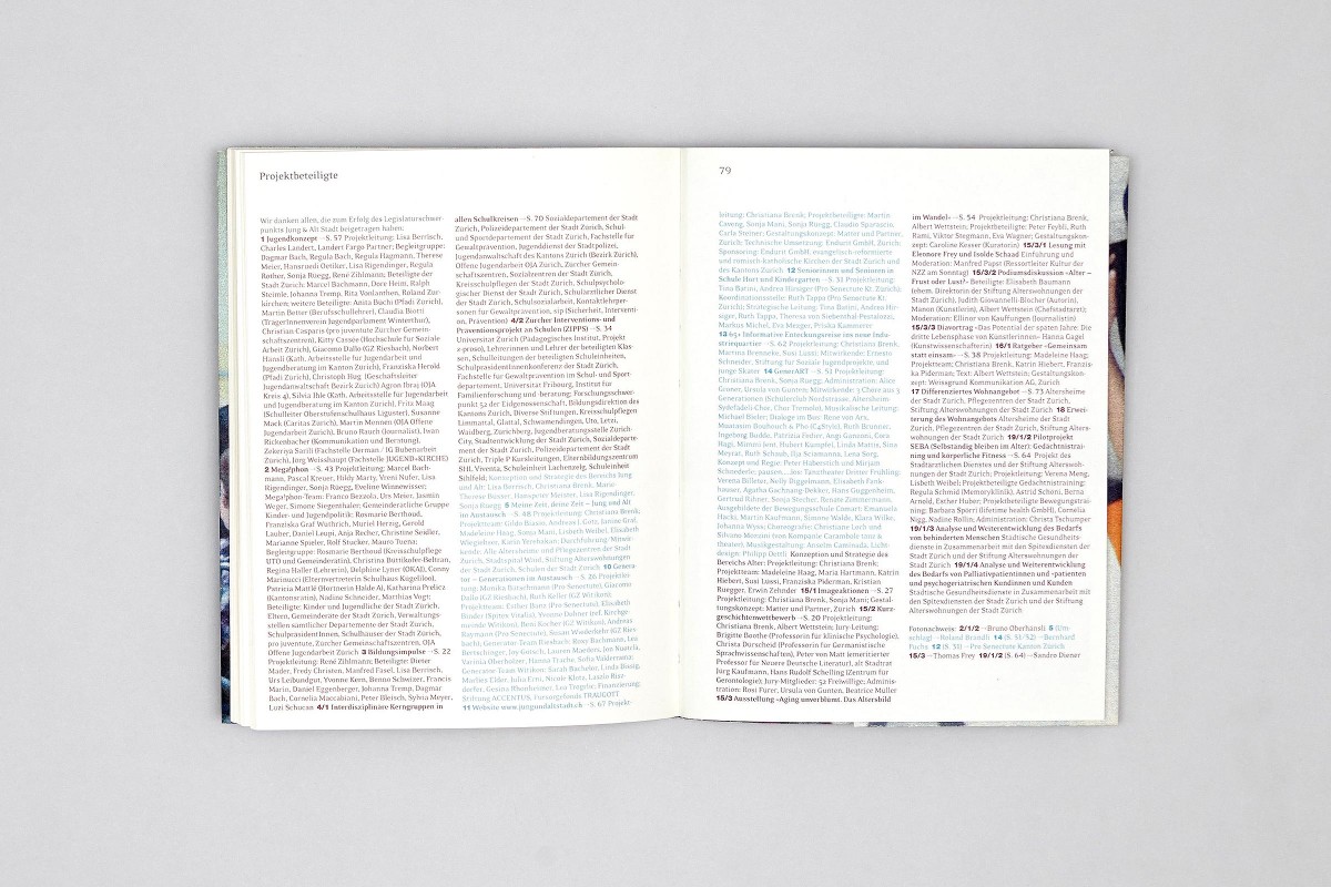 Für den Legislaturschwerpunkt «Jung & Alt Stadt» haben wir ein Buch gestaltet, das die herausragenden zwanzig Projekte zugänglich in Text und Bild dokumentiert. Für Jung und Alt in der Stadt Zürich.