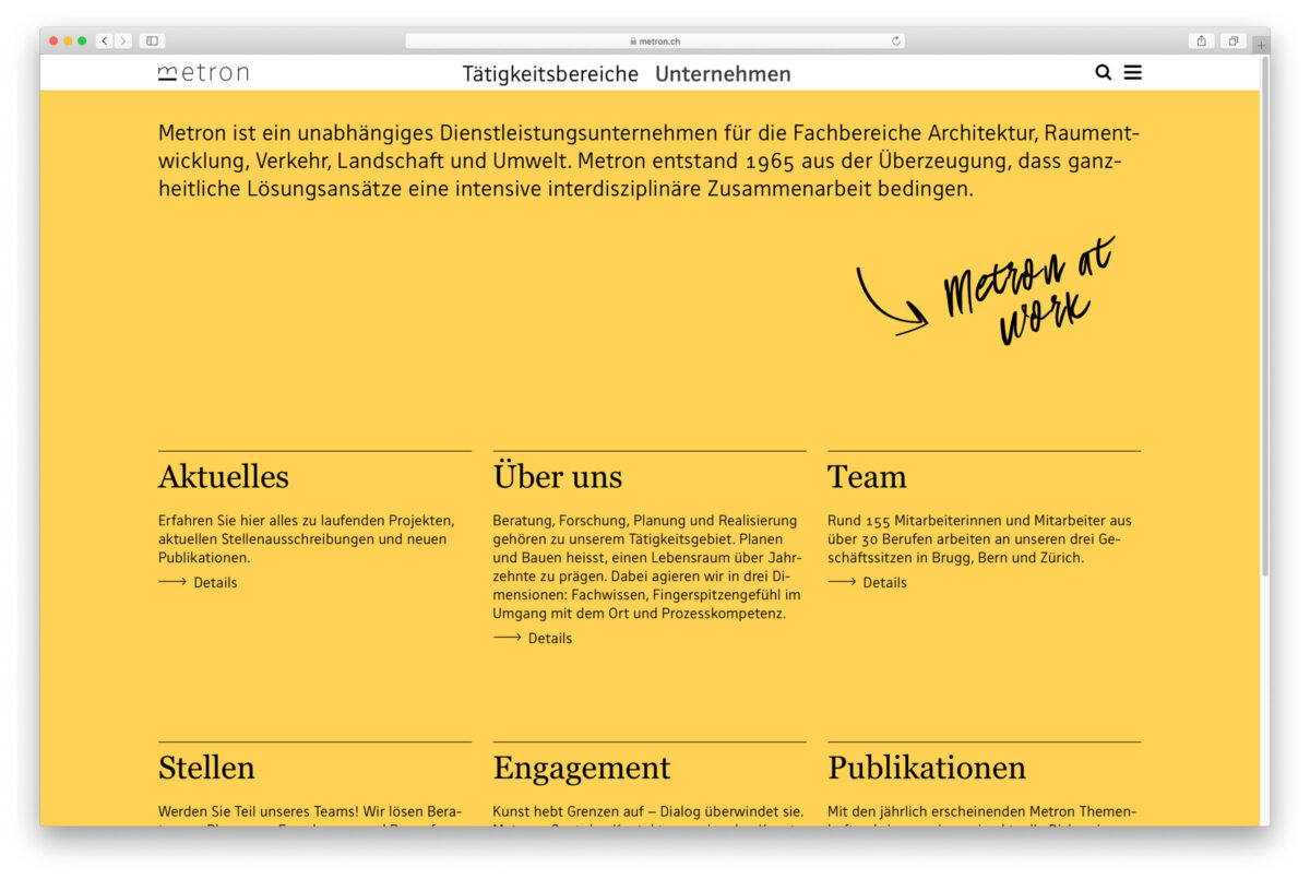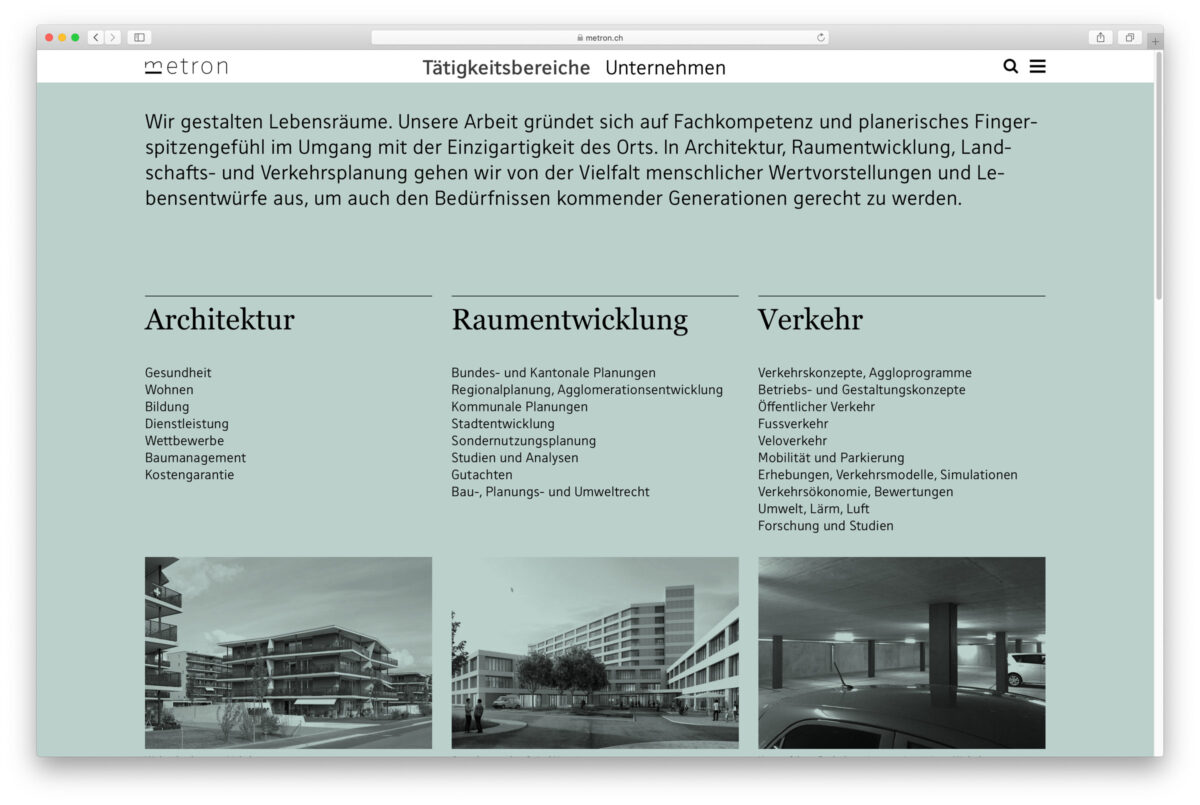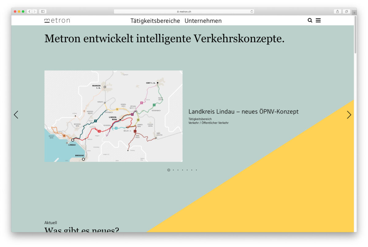 Seit 1965: Umfassende Dienstleistungen in den Bereichen Architektur, Raumentwicklung, Verkehr, Landschaft und Umwelt. Der neue online Auftritt von Metron setzt neue Massstäbe in der Planerlandschaft.