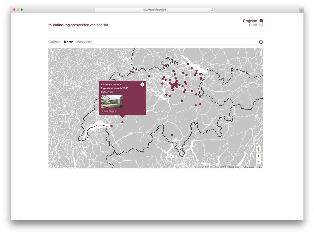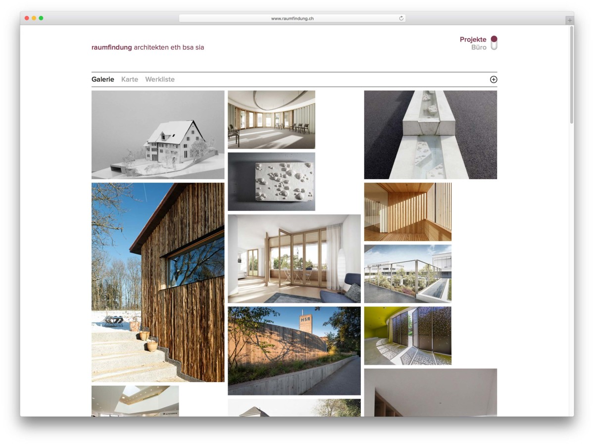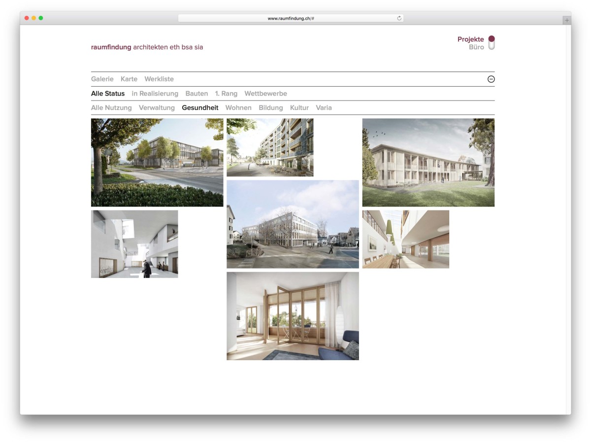 Die Website der Raumfindung Architekten ist grosszügig in zwei Bereiche «Projekte» und «Büro» aufgeteilt. Die Projekte können über Galerie-, Karte- oder Listen-Ansichten entdeckt oder gefunden werden. Dynamische Filterfunktionen helfen die Auswahl in Bereiche einzugrenzen.