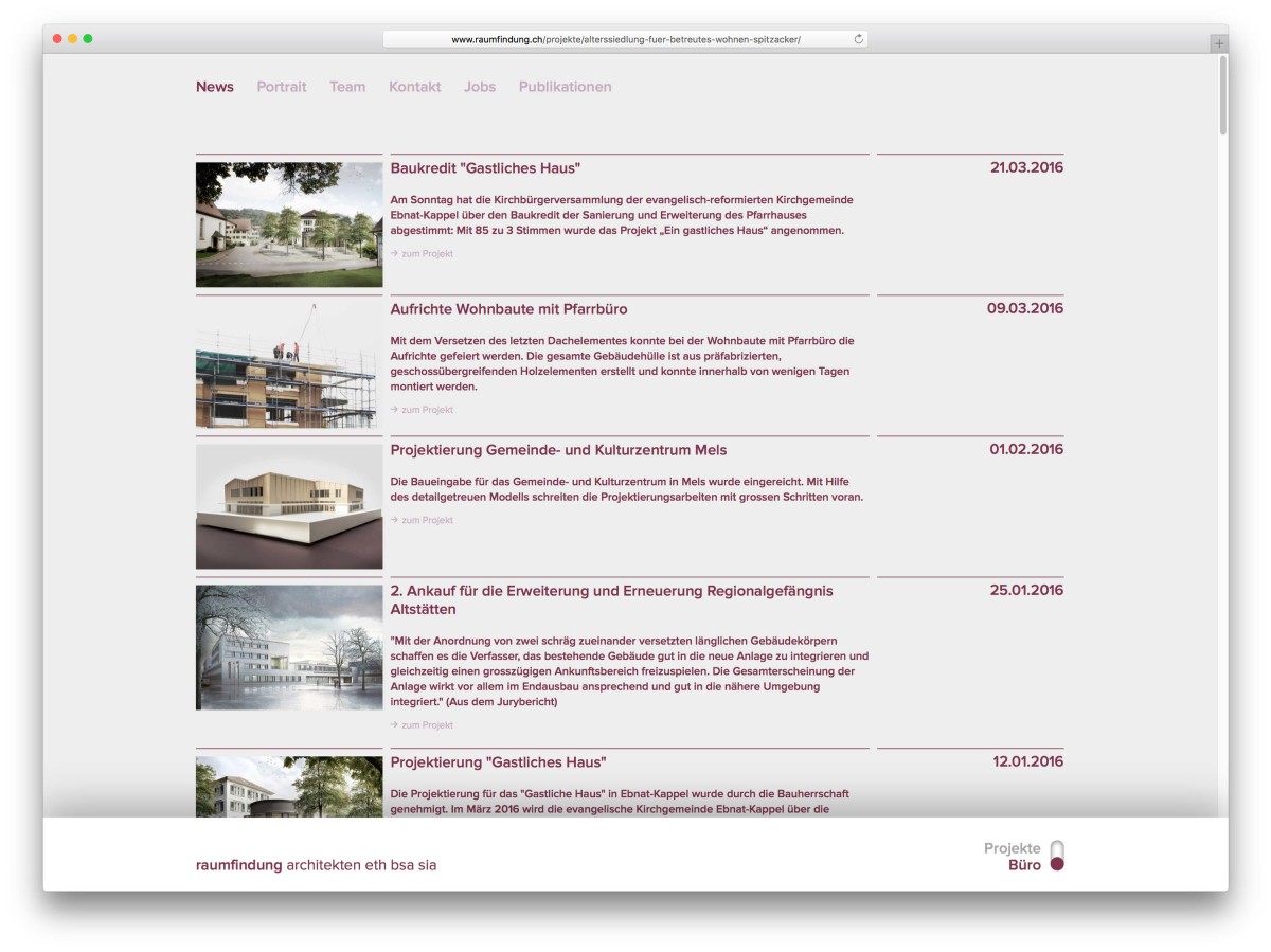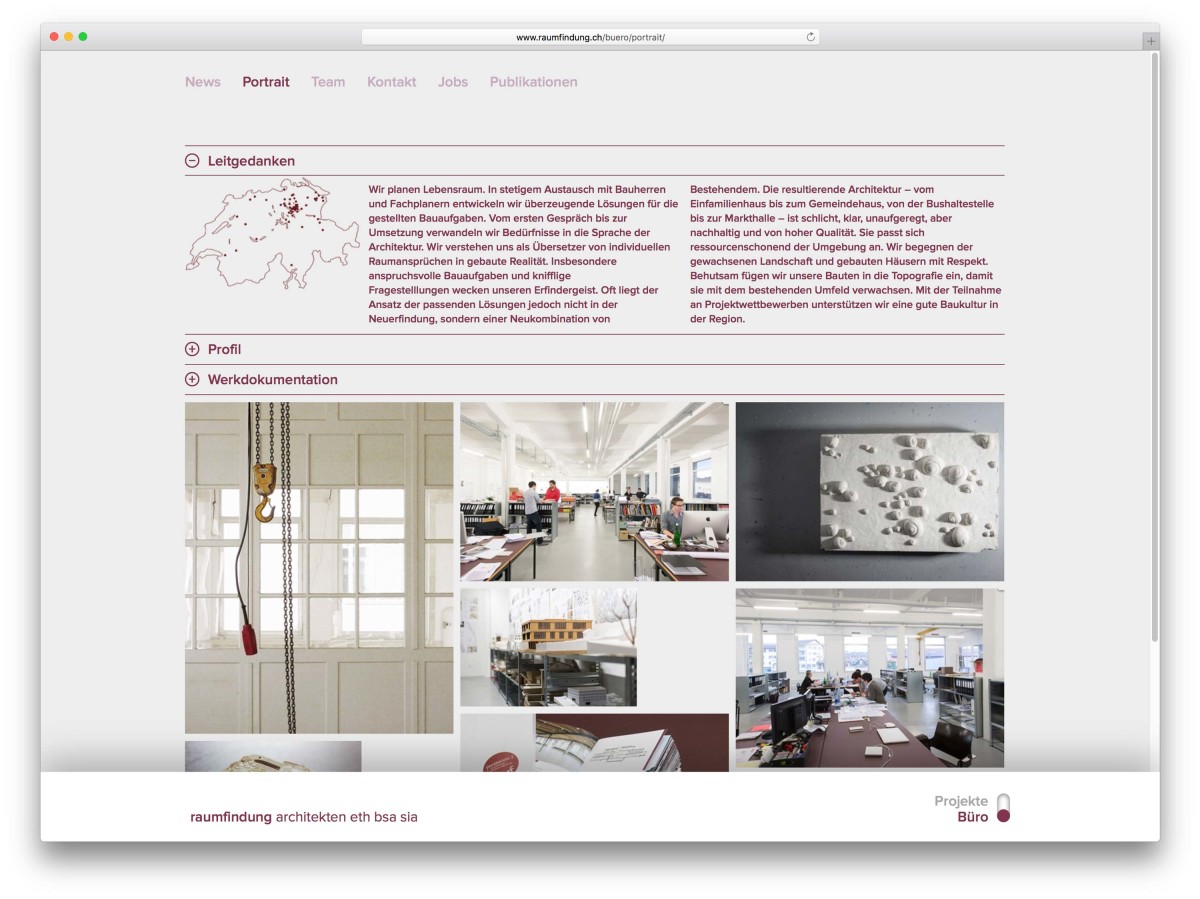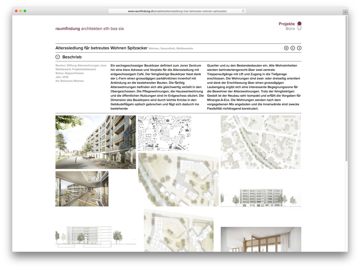 Die Website der Raumfindung Architekten ist grosszügig in zwei Bereiche «Projekte» und «Büro» aufgeteilt. Die Projekte können über Galerie-, Karte- oder Listen-Ansichten entdeckt oder gefunden werden. Dynamische Filterfunktionen helfen die Auswahl in Bereiche einzugrenzen.
