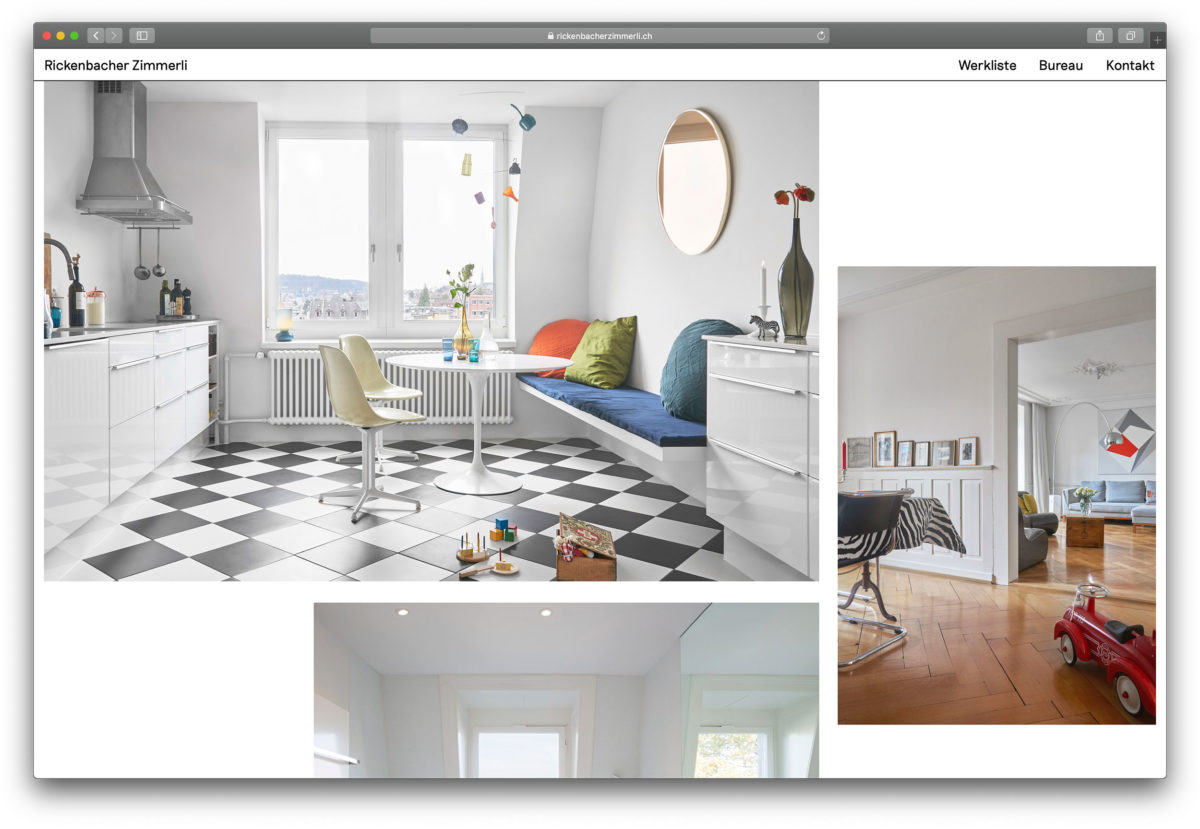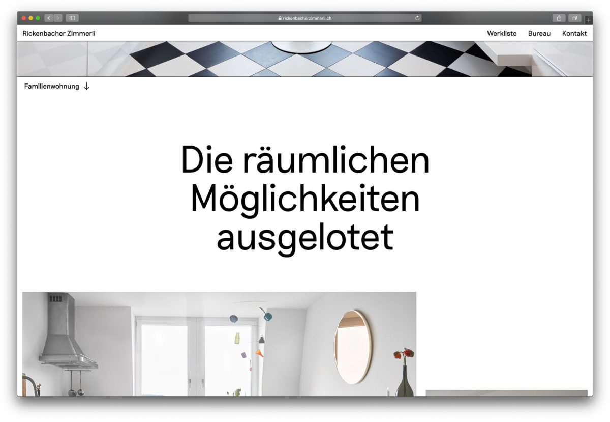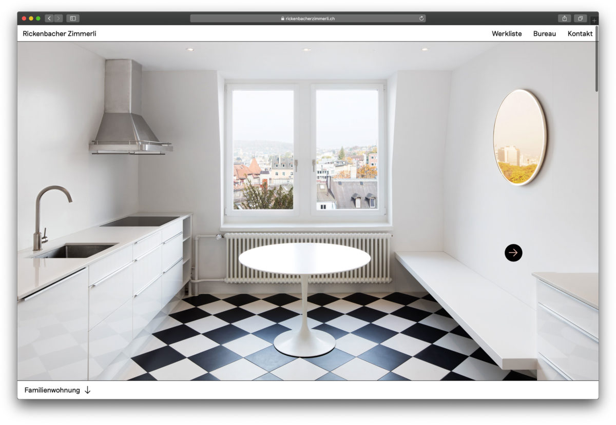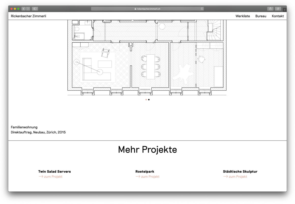 Browserfüllende Projektfotografien und eine überzeugend einfache Benutzerführung. www.rickenbacherzimmerli.ch Nächstes Projekt