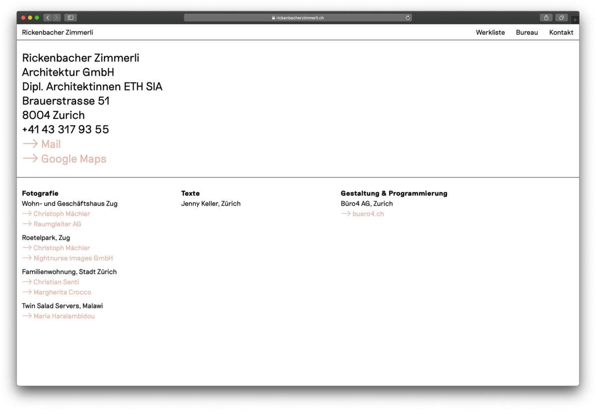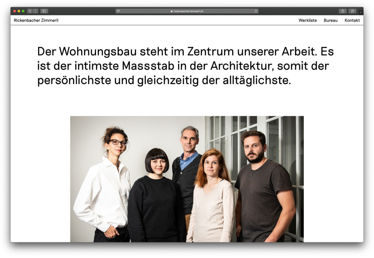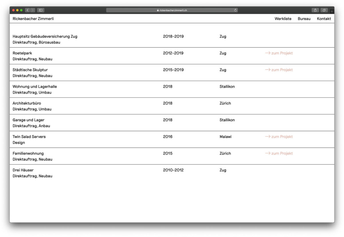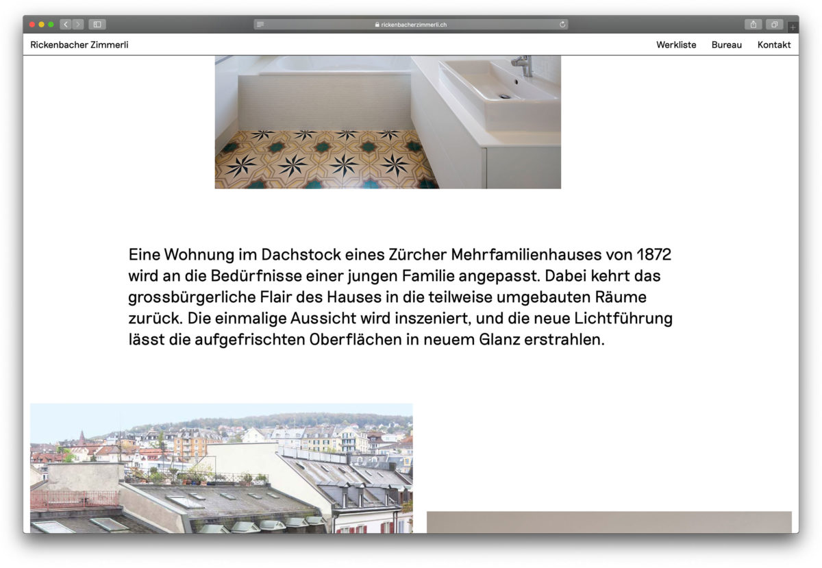Browserfüllende Projektfotografien und eine überzeugend einfache Benutzerführung. www.rickenbacherzimmerli.ch Nächstes Projekt