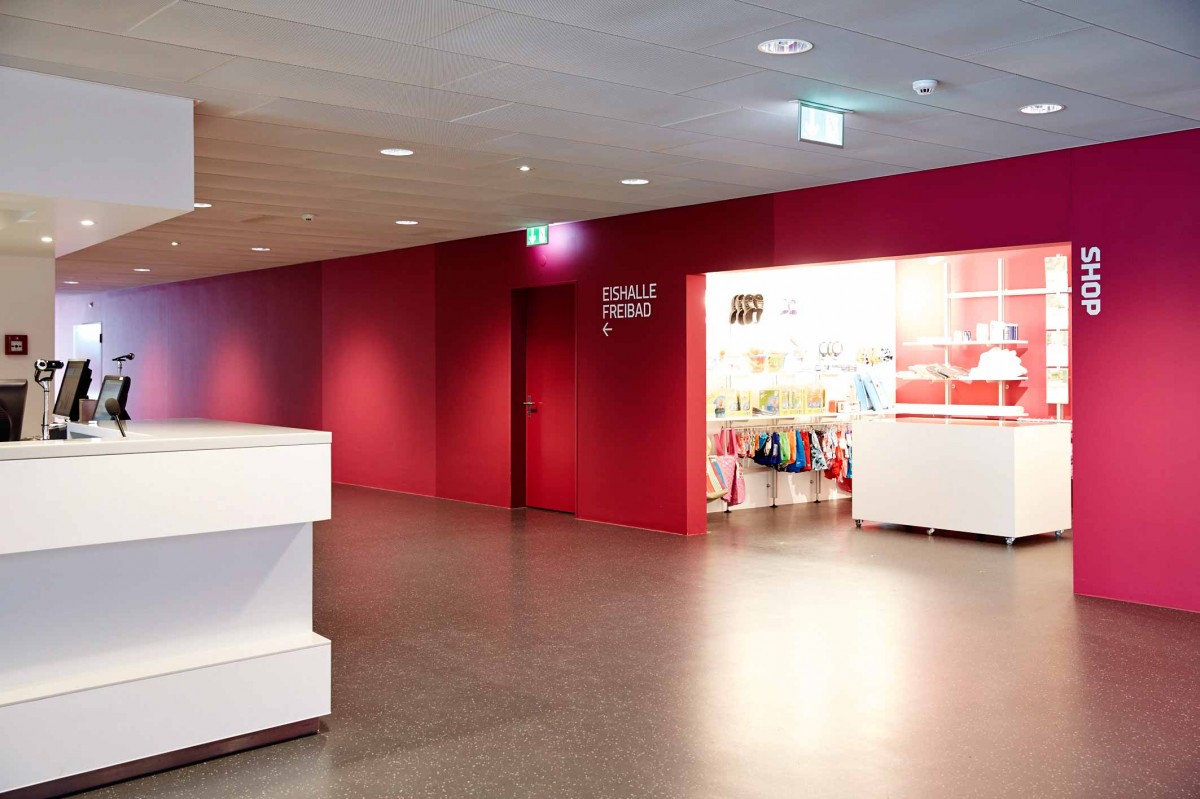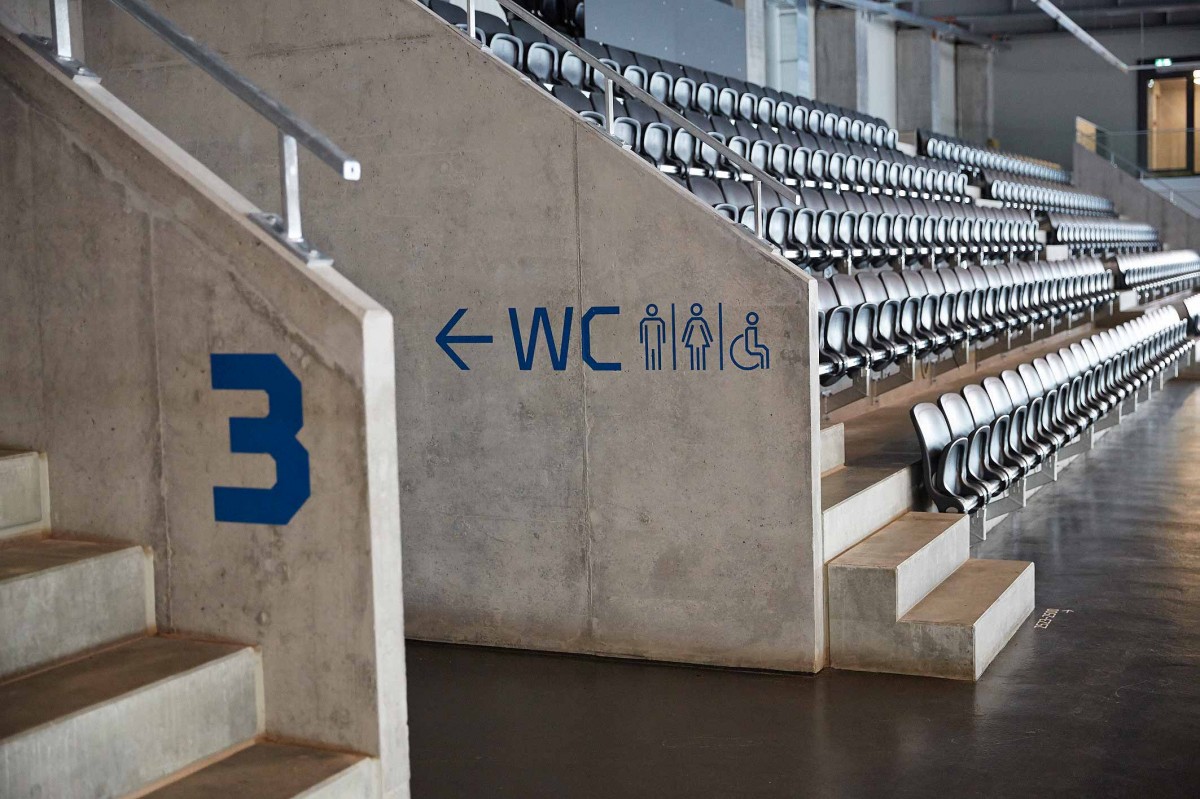 Die Signaletik für die neue Ostschweizer Sportstätte mit Fussballstadion, Eishalle, Hallen- und Freibad und einem Wellnessbereich korrespondiert perfekt mit der Formensprache der Architektur. Die in den entsprechenden Bereichsfarben direkt auf die verschiedenen Oberflächen applizierten Beschriftungen versinnbildlichen unsere gestalterische Absicht auf einfache Weise. Sportlich und schnörkellos.