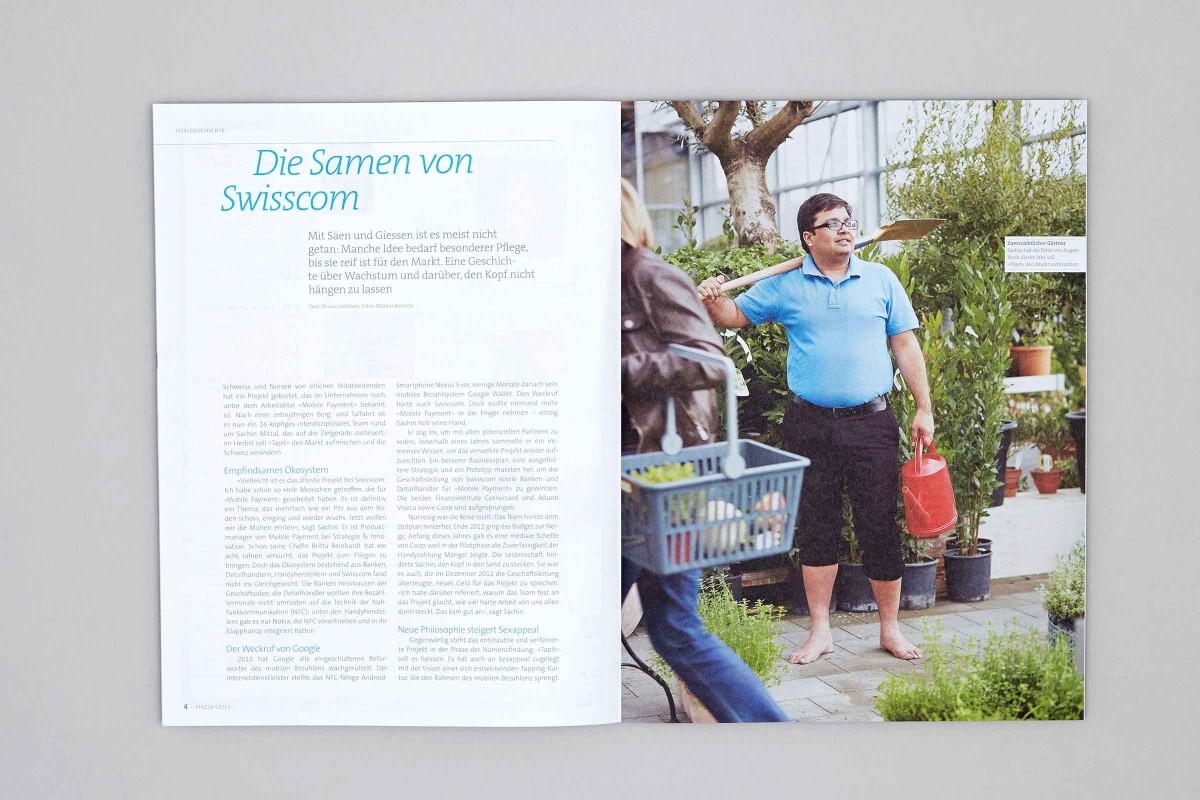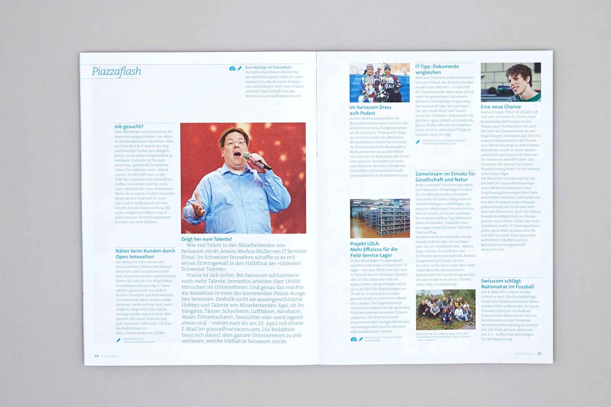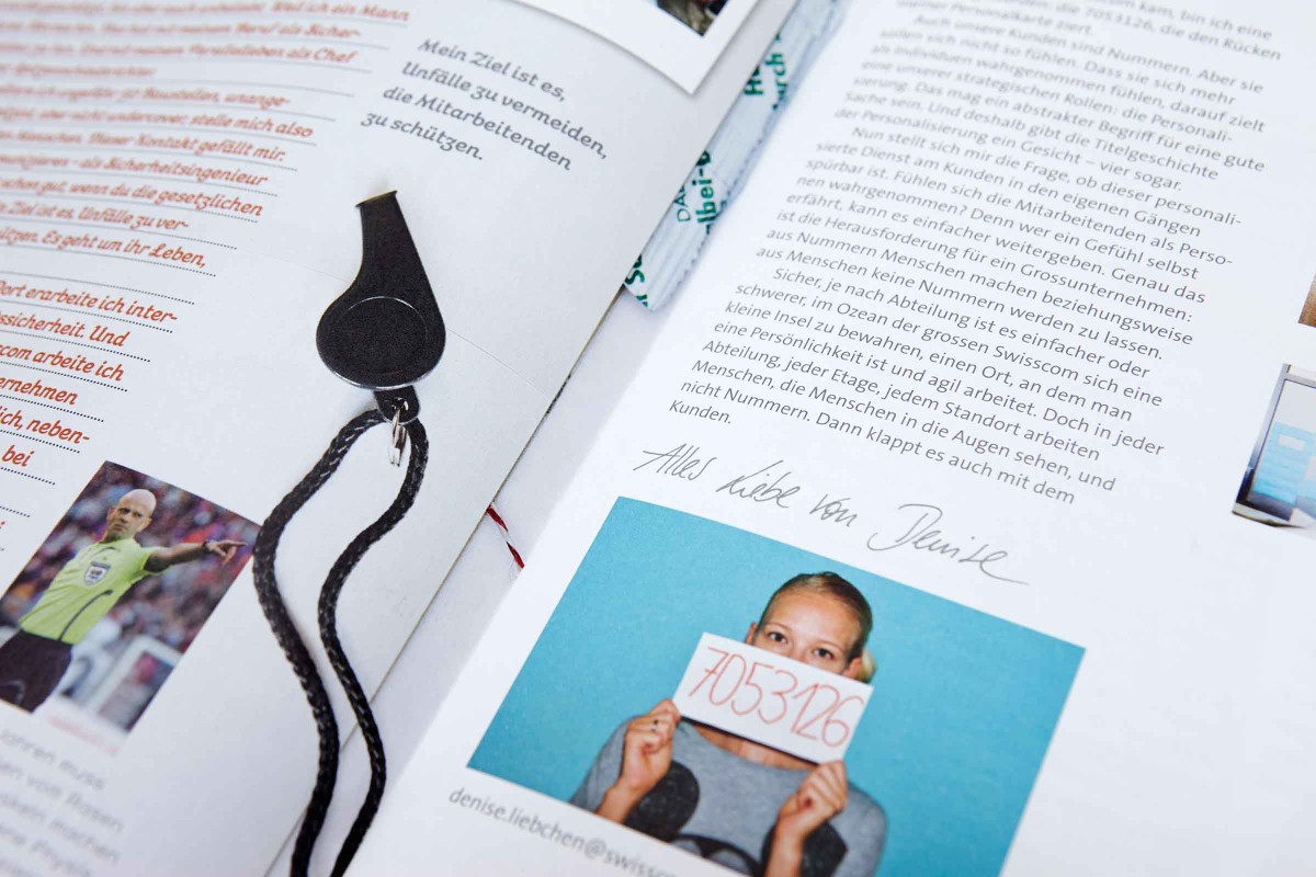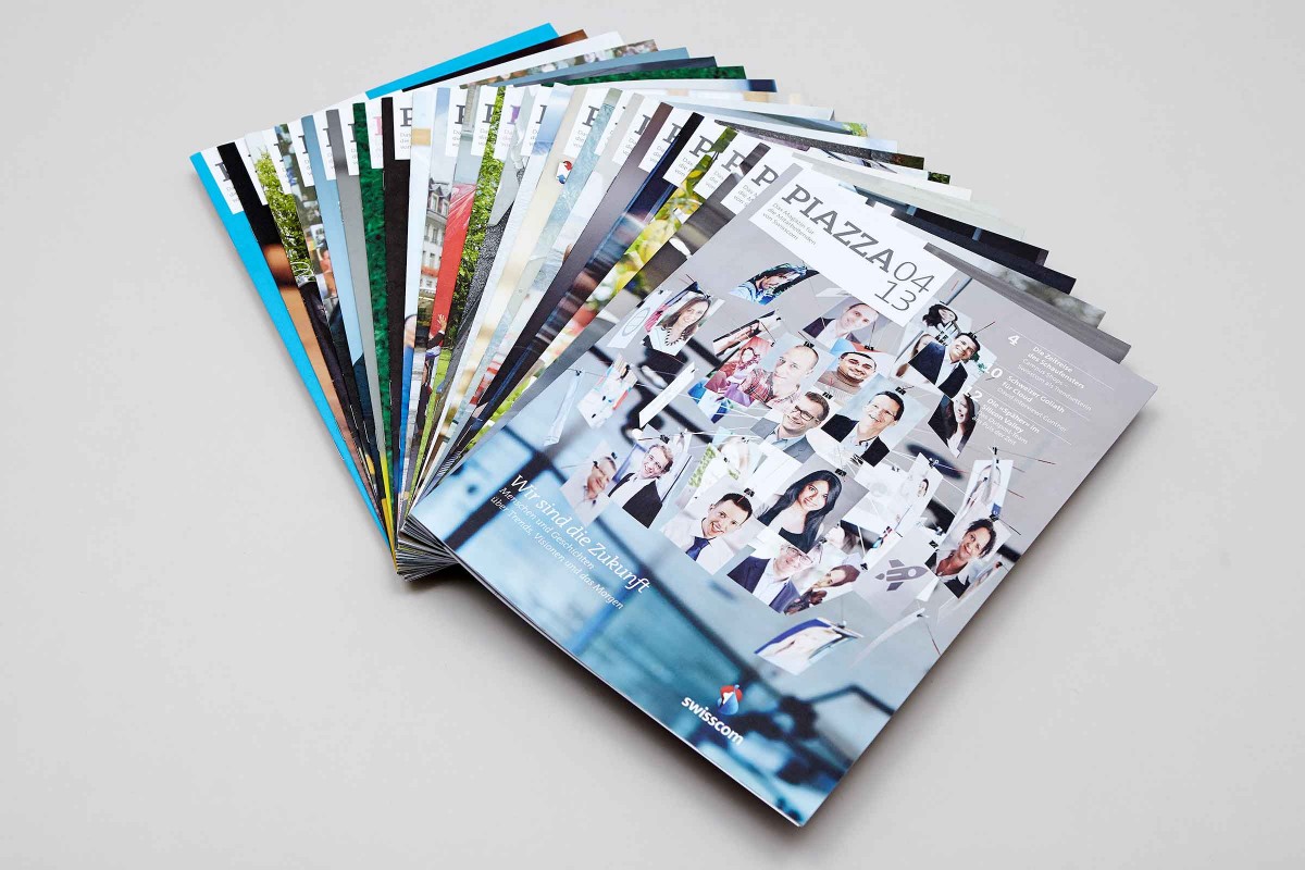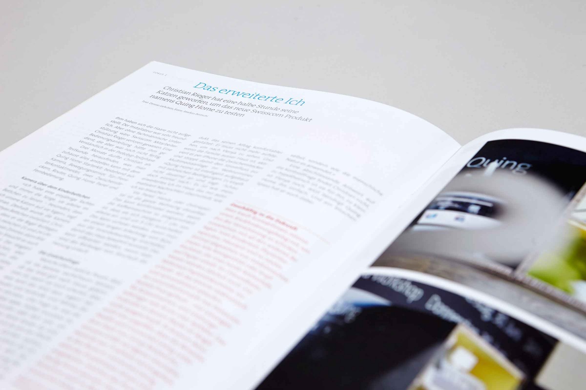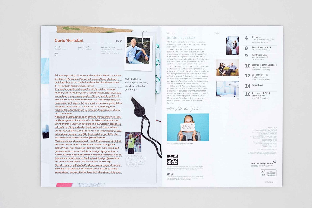 Ein Heft für die Mitarbeitenden von Swisscom. Redaktionell ganz am Puls der Menschen, die dort arbeiten. Die Gestaltung auch. Corporate, und dennoch überraschend andere Rubriken schaffend, um den Rahmen da und dort zu sprengen. Ganz im Sinne eines Magazins von heute.