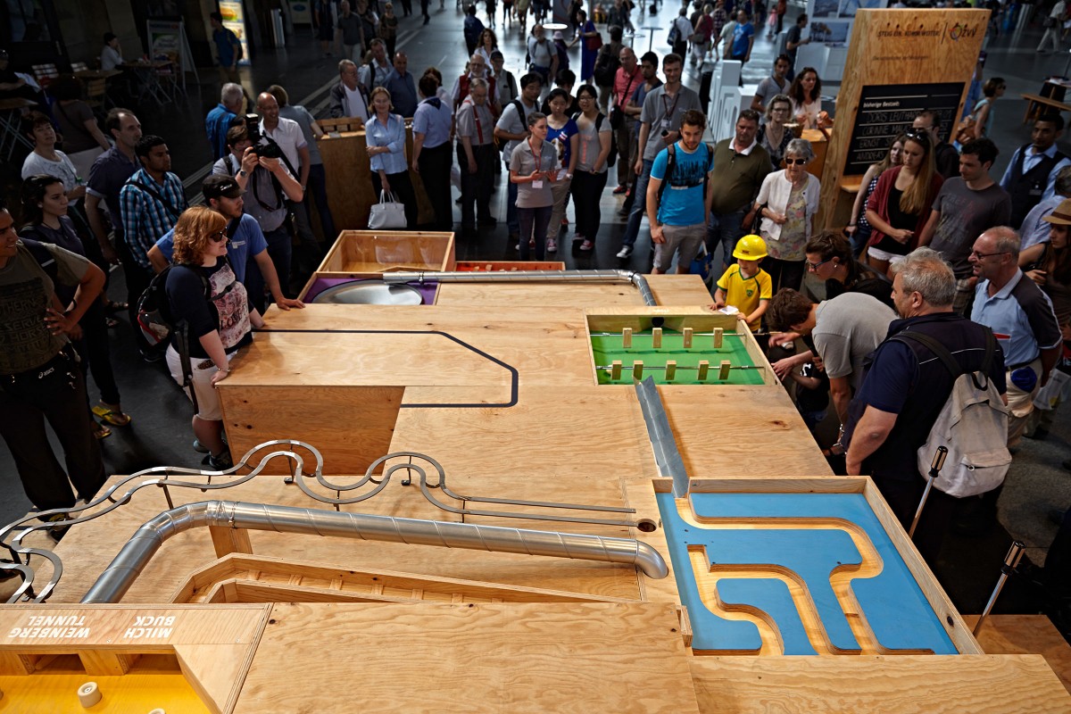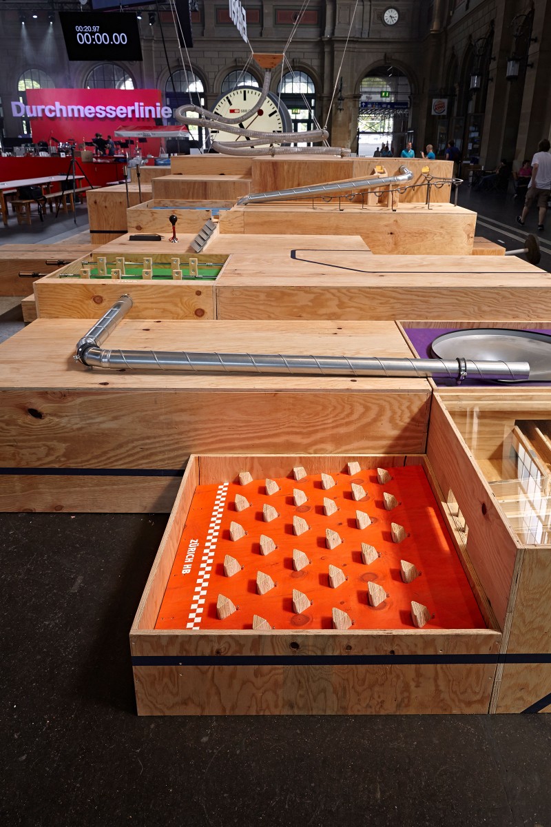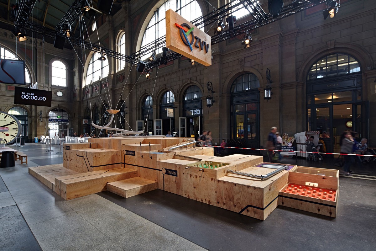 Anlässlich der Eröffnungsfeier des Jahrhundert-Bauprojekts der «SBB Durchmesserlinie» entwickelten wir für den Zürcher Verkehrsverbund eine überdimensionierte Kugelbahn. Wer schafft die schnellste Verbindung von Oerlikon zum Hauptbahnhof? Frau Bundesrätin Leuthard und weitere illustre Persönlichkeiten aus Wirtschaft und Politik weihten die Bahn ein und setzten Bestzeiten, die es dann zu unterbieten galt.
